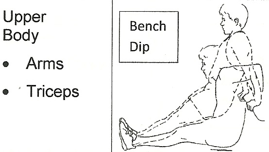 #2.  Bench Dip:  Keeping elbows close to sides, lower body almost to floor.  Then press upward until arms are straight.  Easier:  Knees bent and feet flat on the floor. More difficult:  Straighten legs; put feet on chair in front. Do 10 reps per set.