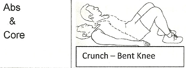 #3Crunch – Bent Knee:  Lay on back, knees bent, arms straight at sides. Keep head & neck in line with spine, tighten abs. Raise shoulders & upper back toward ceiling. Low / middle back & arms stay on floor. Do 15 reps per set.