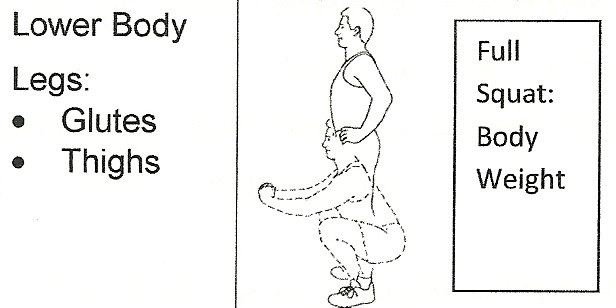 #4.  Full Squat: Head is up; back is straight; feet are pointed slightly out. Squat until backs of thighs touch calves. (Easier: thighs parallel to floor). Keep abs tight; balance weight on heels. Adjust arm position for balance. Do 10 reps per set.