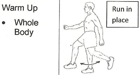 #1. Run in place as quickly as possible. Pump arms while moving legs. Easier:  slow down or march in place. More difficult:  raise knees higher (to chest). Do this Warm-Up for 2 minutes only at the beginning of circuit session.