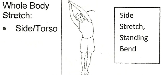 #8Standing Bend:  Stand with feet together and reach overhead with palms touching. Bend body to one side as fa as possible. Repeat on other side. Do this Cool Down Stretch only at the end of circuit session.