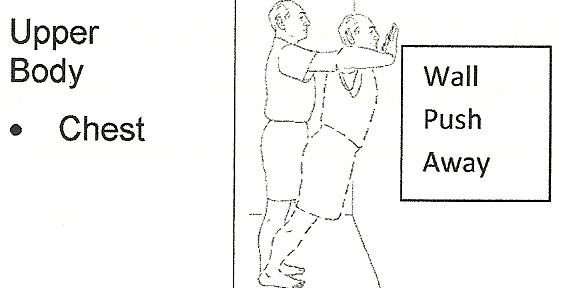 #5Wall Push Away:  Facing wall, place hands (fingers up) on wall about shoulder width apart. With body straight, elbows up and heels on floor, lean into wall. Hold position for 4 seconds, then push away using arms. Do 15 reps per set.