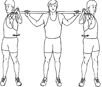 - Twisting at the waist, rotate upper body from side to side. Be sure to keep the back straight.