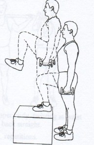 Keeping head up and back straight, place right foot on a bench, step or a box. May hold dumbbell in each hand at sides.