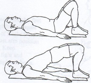 Lie on your back with knees bent, feet about shoulder width apart and flat on the floor.