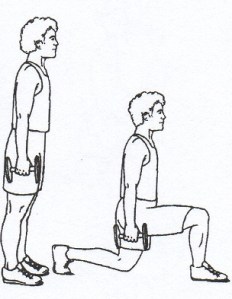 Step forward, bending both legs simultaneously until thigh of front leg is parallel to the floor. The heel of the back foot will come off the floor.