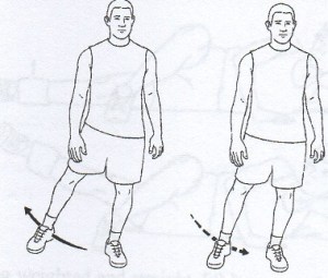 Stand with head up, back straight and feet about hip distance apart, toes pointed forward. May use leg weight with this exercise.