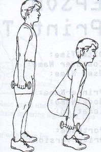 Stand with legs shoulder width apart (wide stance), back straight and head up. May hold dumbbell in each hand at sides.