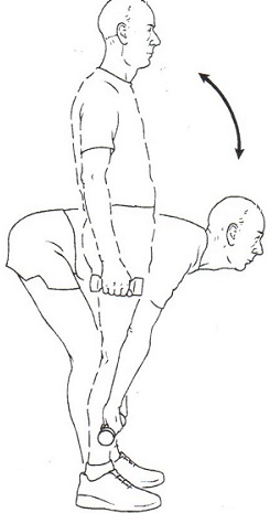 - Stand, holding weights at each side with knees slightly bent.