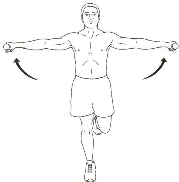 - Standing on left leg hold weights at each side.