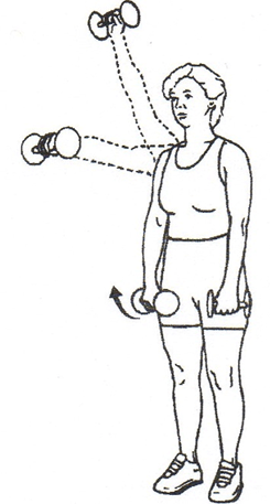 - Keeping arms straight raise the dumbbells at arm’s length overhead.