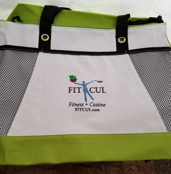 100% cotton, white and bright green with Velcro front pocket and two black mesh side pockets, zip top, full color logo